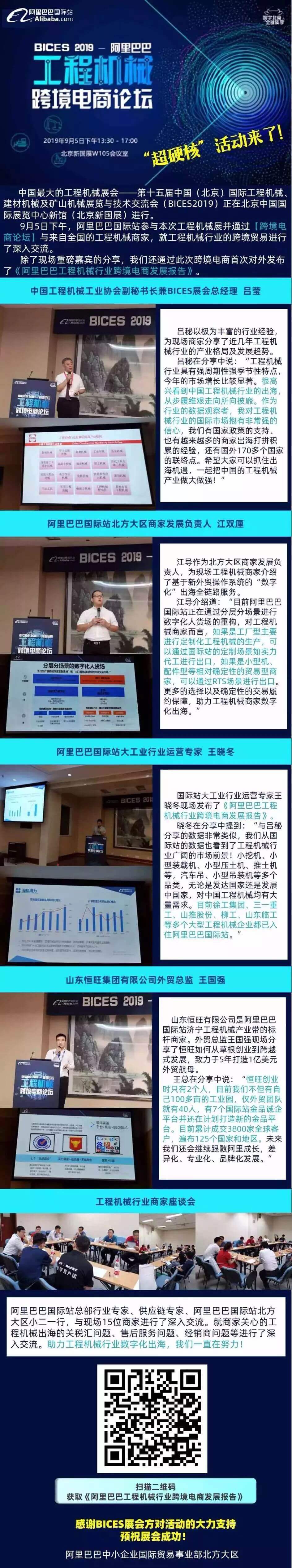 Alibaba international station participated in the construction machinery exhibition deeply, and held the BBS of alibaba construction machinery cross-border e-commerce in conference room W105 from 13:30 to 17:30 on september 5. The full record of this BBS is show in the following figure. You can also scan the qr cord at the end of the figure to obtain 《The development report of cross-border e-commerce in alibaba construction machinery industry》 for free.